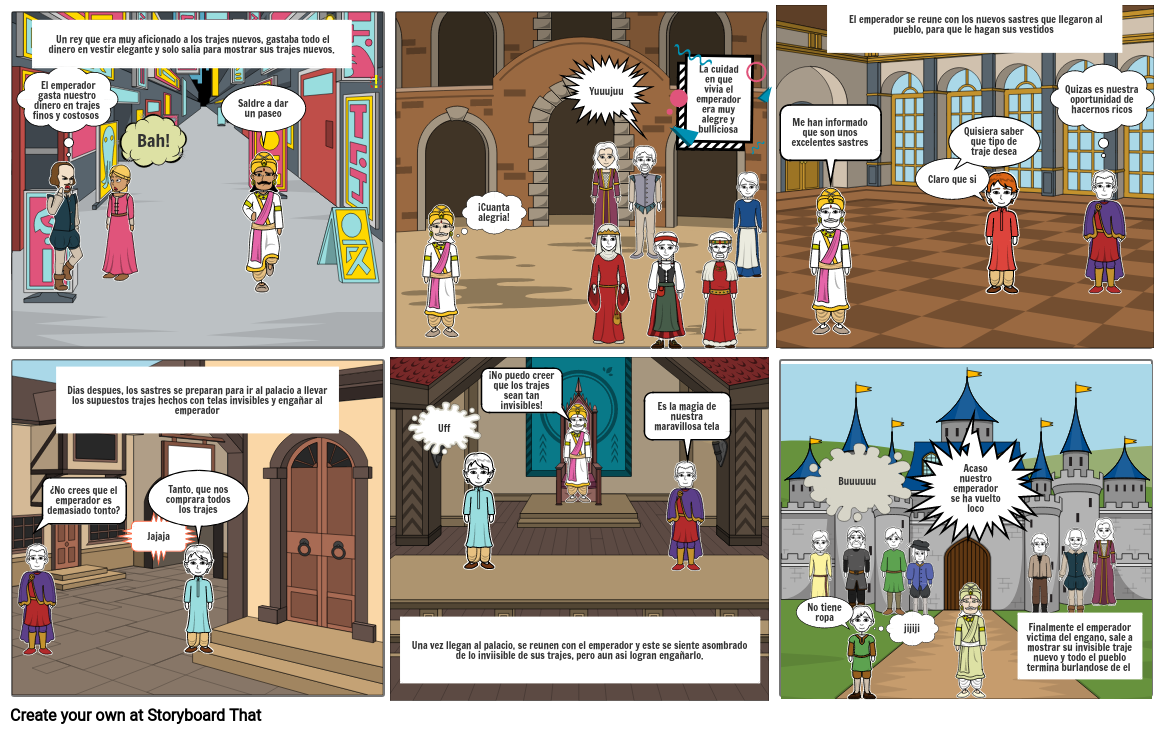 Finalmente el emperador victima del engano, sale a mostrar su invisible traje nuevo y todo el pueblo termina burlandose de el
