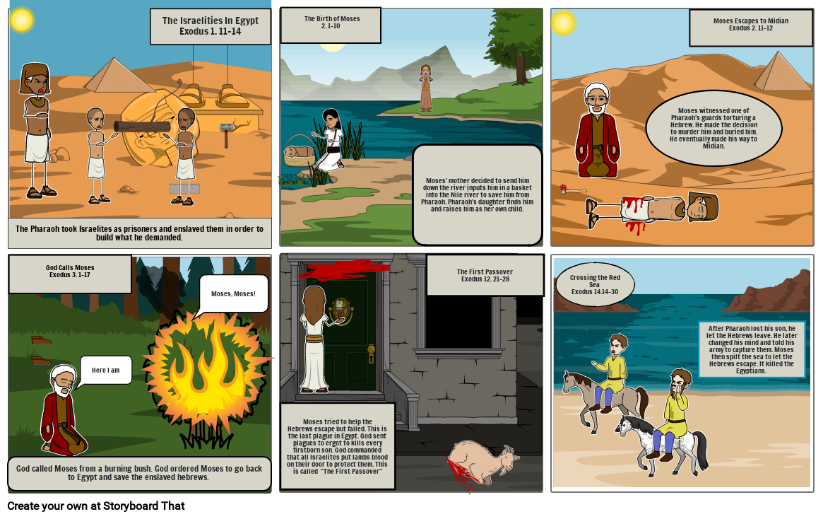 Moses witnessed one of Pharaoh's guards torturing a Hebrew. He made the decision to murder him and buried him. He eventually made his way to Midian.