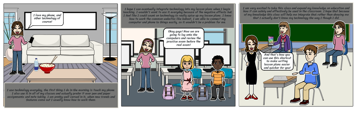 I hope I can eventually integrate technology into my lesson plans when I begin teaching. I wouldn't want to use it everyday because of the negative effects but I feel like I could count on technology to really spice up my lesson plans. I know how to work the common websites like kahoot, I am able to connect my computer and phone to things easily, so it wouldn't be a problem for me.