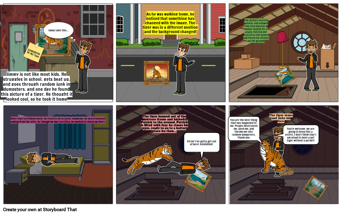 Jimmy is not like most kids. He struggles in school, gets beat up, and goes through random junk in dumpsters, and one day he found this picture of a tiger. He thought it looked cool, so he took it home