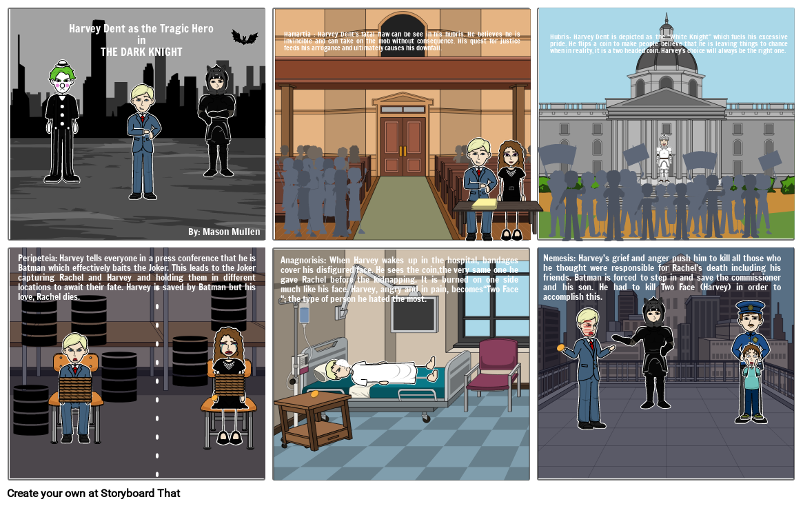 Hamartia : Harvey Dent’s fatal flaw can be see in his hubris. He believes he is invincible and can take on the mob without consequence. His quest for justice feeds his arrogance and ultimately causes his downfall.