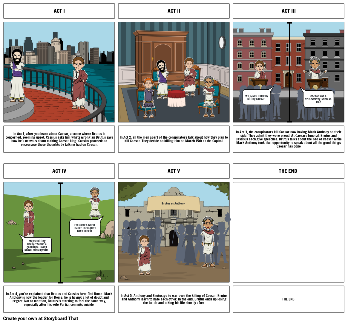 In Act 5, Anthony and Brutus go to war over the killing of Caesar. Brutus and Anthony learn to hate each other. In the end, Brutus ends up losing the battle and taking his life shortly after.