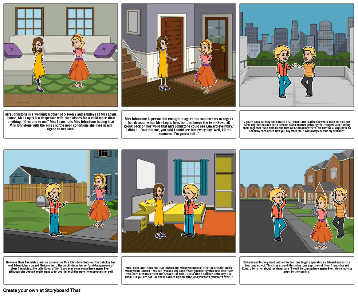 However their friendship isn't as discreet as Mrs Johnstone finds out that Mickey has met Edward, her son and Mickeys twin. She quickly fixes herself and disapproves of their friendship. She tells Edward Don't you ever come round here again. Ever although she doesn't really want to forget him with the way she expresses herself.