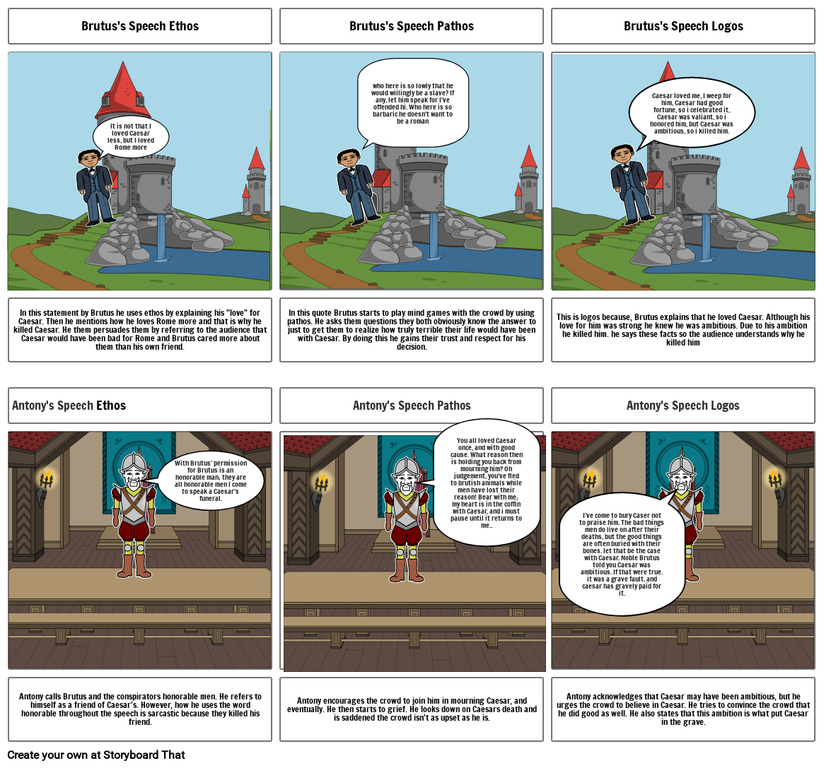 In this statement by Brutus he uses ethos by explaining his "love" for Caesar. Then he mentions how he loves Rome more and that is why he killed Caesar. He them persuades them by referring to the audience that Caesar would have been bad for Rome and Brutus cared more about them than his own friend.
