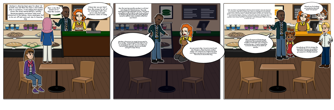 Marleen's shop has been open for about 10 months now and there has been a noticeable drop in customers. A new bakery had opened across the street named philly's, quickly becoming popular customers were more interested in the bakery. Some employees had to be cut off and some quit due to lowering pay.