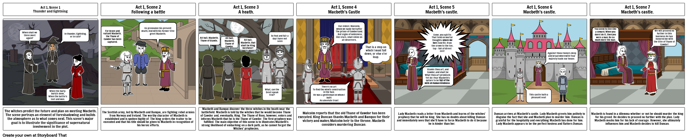 Malcolm reports that the old Thane of Cawdor has been executed. King Duncan thanks Macbeth and Banquo for their victory and makes Malcolm heir to the throne. Macbeth considers murdering Duncan.