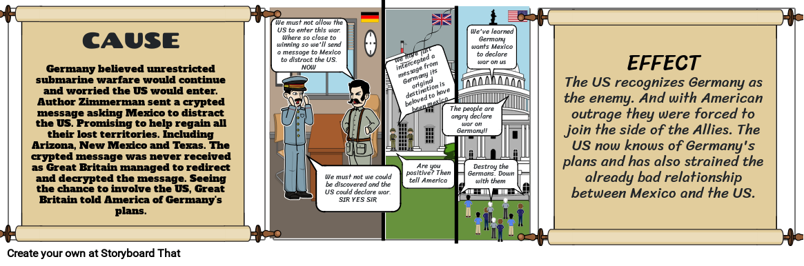 CAUSEGermany believed unrestricted submarine warfare would continue and worried the US would enter. Author Zimmerman sent a crypted message asking Mexico to distract the US. Promising to help regain all their lost territories. Including Arizona, New Mexico and Texas. The crypted message was never received as Great Britain managed to redirect and decrypted the message. Seeing the chance to involve the US, Great Britain told America of Germany's plans.