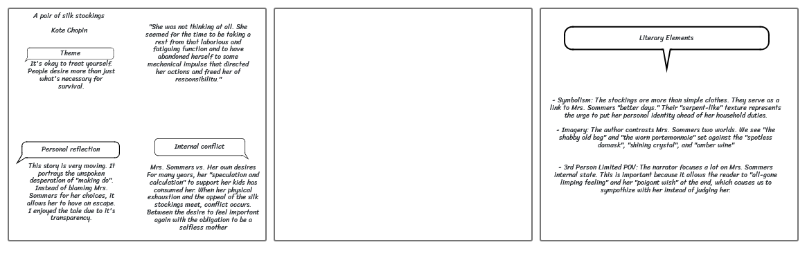- Symbolism: The stockings are more than simple clothes. They serve as a link to Mrs. Sommers "better days." Their "serpent-like" texture represents the urge to put her personal identity ahead of her household duties.- Imagery: The author contrasts Mrs. Sommers two worlds. We see "the shabby old bag" and "the worn portemonnaie" set against the "spotless damask", "shining crystal", and "amber wine"- 3rd Person Limited POV: The narrator focuses a lot on Mrs. Sommers internal state. This is important because it allows the reader to "all-gone limping feeling" and her "poigant wish" at the end, which causes us to sympathize with her instead of judging her.