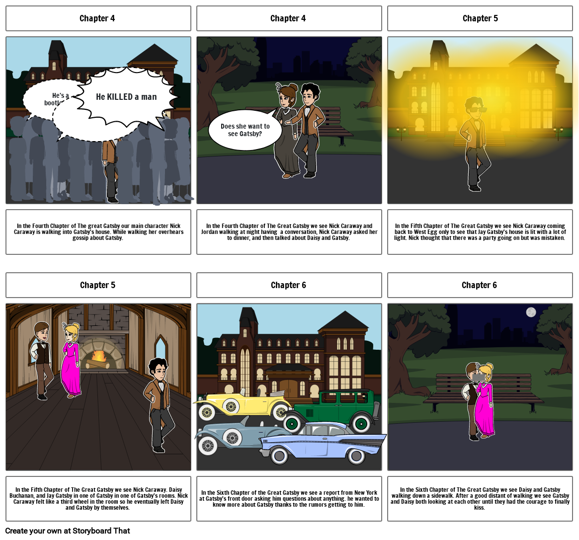 In the Fourth Chapter of The great Gatsby our main character Nick Caraway is walking into Gatsby's house. While walking her overhears gossip about Gatsby.
