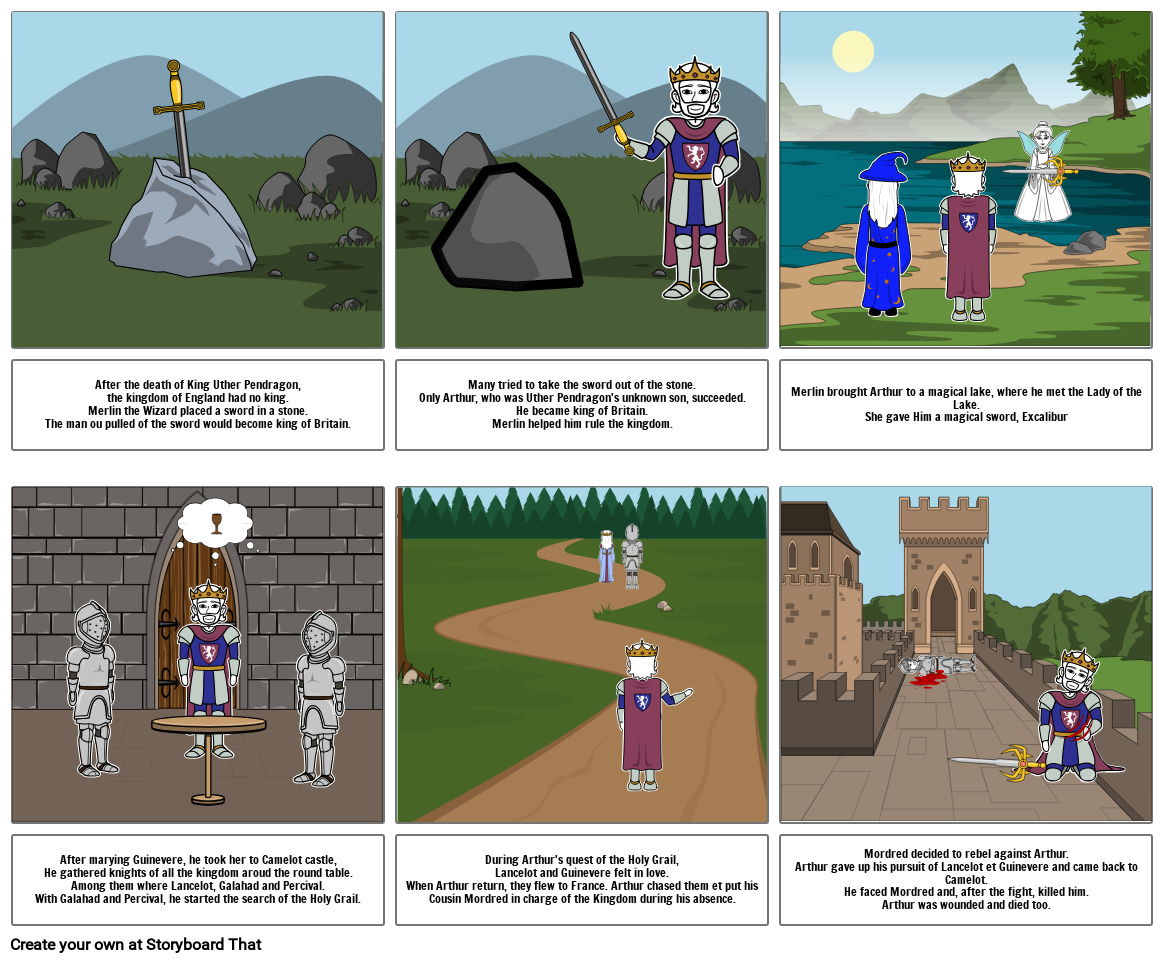 Mordred decided to rebel against Arthur.Arthur gave up his pursuit of Lancelot et Guinevere and came back to Camelot.He faced Mordred and, after the fight, killed him.Arthur was wounded and died too.