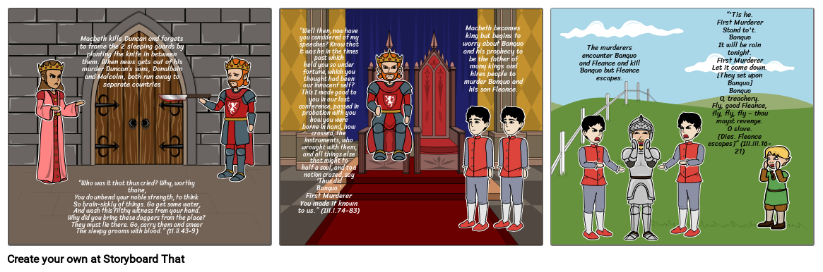 Macbeth kills Duncan and forgets to frame the 2 sleeping guards by planting the knife in between them. When news gets out of his murder Duncan’s sons, Donalbain and Malcolm, both run away to separate countries