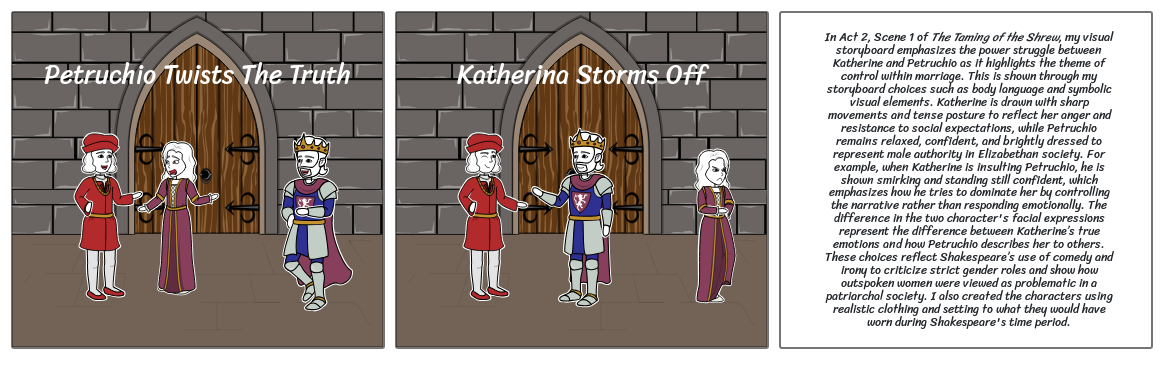 In Act 2, Scene 1 of The Taming of the Shrew, my visual storyboard emphasizes the power struggle between Katherine and Petruchio as it highlights the theme of control within marriage. This is shown through my storyboard choices such as body language and symbolic visual elements. Katherine is drawn with sharp movements and tense posture to reflect her anger and resistance to social expectations, while Petruchio remains relaxed, confident, and brightly dressed to represent male authority in Elizabethan society. For example, when Katherine is insulting Petruchio, he is shown smirking and standing still confident, which emphasizes how he tries to dominate her by controlling the narrative rather than responding emotionally. The difference in the two character's facial expressions represent the difference between Katherine’s true emotions and how Petruchio describes her to others. These choices reflect Shakespeare’s use of comedy and irony to criticize strict gender roles and show how outspoken women were viewed as problematic in a patriarchal society. I also created the characters using realistic clothing and setting to what they would have worn during Shakespeare's time period.