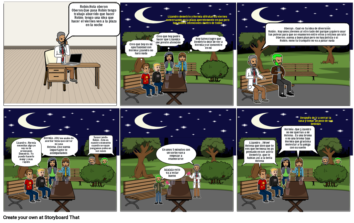 Oberon : Cual es tu idea de diversiónRobin : Hay unos jóvenes al otro lado del parque y quiero usar tus polvos para que se enamoren entre ellos y reírnos un ratoOberon :suena a buen plan pero no hay policía o siRobin: nono tu tranquilo no va a pasar nada