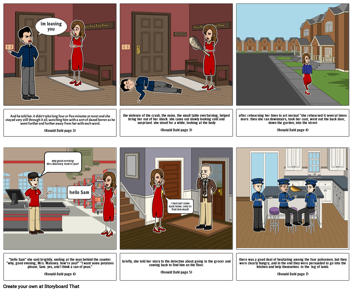 briefly, she told her story to the detective about going to the grocer and coming back to find him on the floor.(Ronald Dahl page 5)