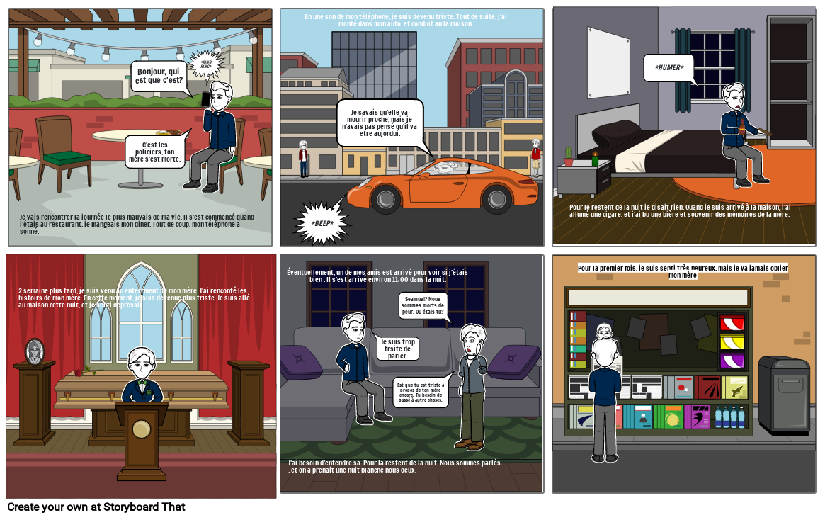 2 semaine plus tard, je suis venu au enterrment de mon mère. J'ai renconté les histoirs de mon mère. En cette moment, je suis devenue plus triste. Je suis allé au maison cette nuit, et je senti depressif.