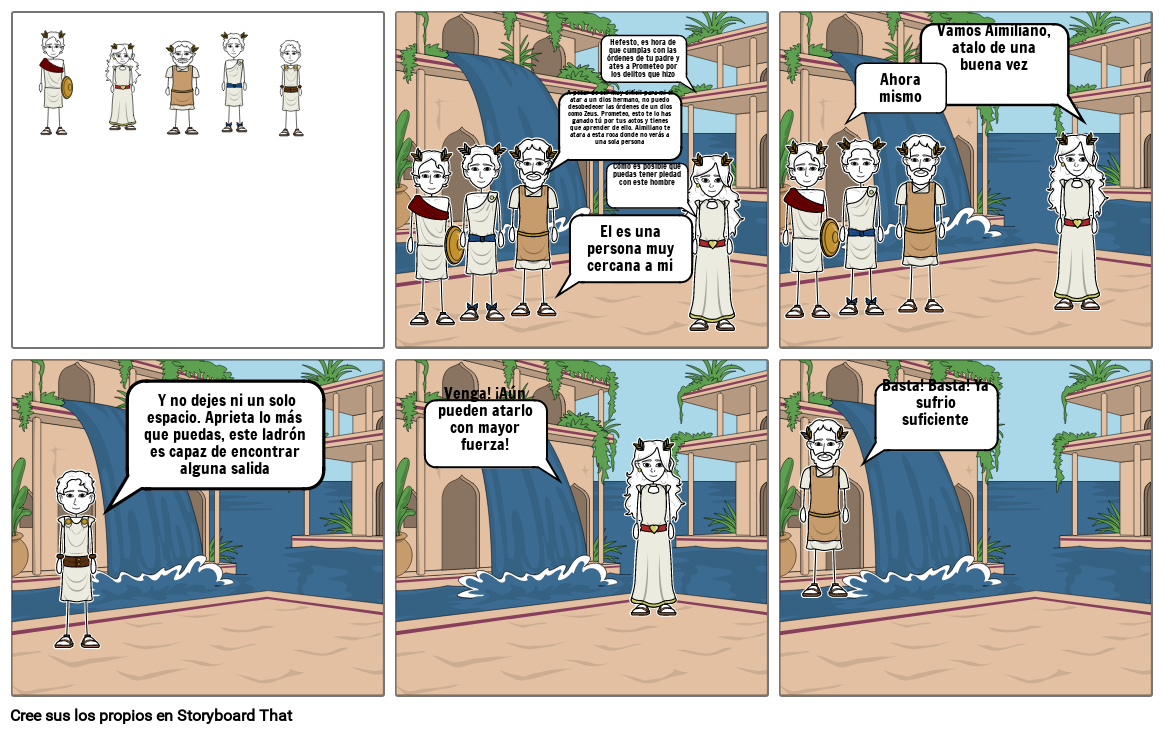 A pesar de ser muy difícil para mi el atar a un dios hermano, no puedo desobedecer las órdenes de un dios como Zeus. Prometeo, esto te lo has ganado tú por tus actos y tienes que aprender de ello. Aimiliano te atara a esta roca donde no verás a una sola persona