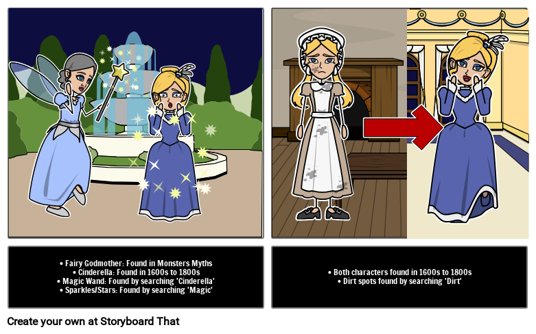 • Fairy Godmother: Found in Monsters Myths• Cinderella: Found in 1600s to 1800s• Magic Wand: Found by searching 'Cinderella'• Sparkles/Stars: Found by searching 'Magic'