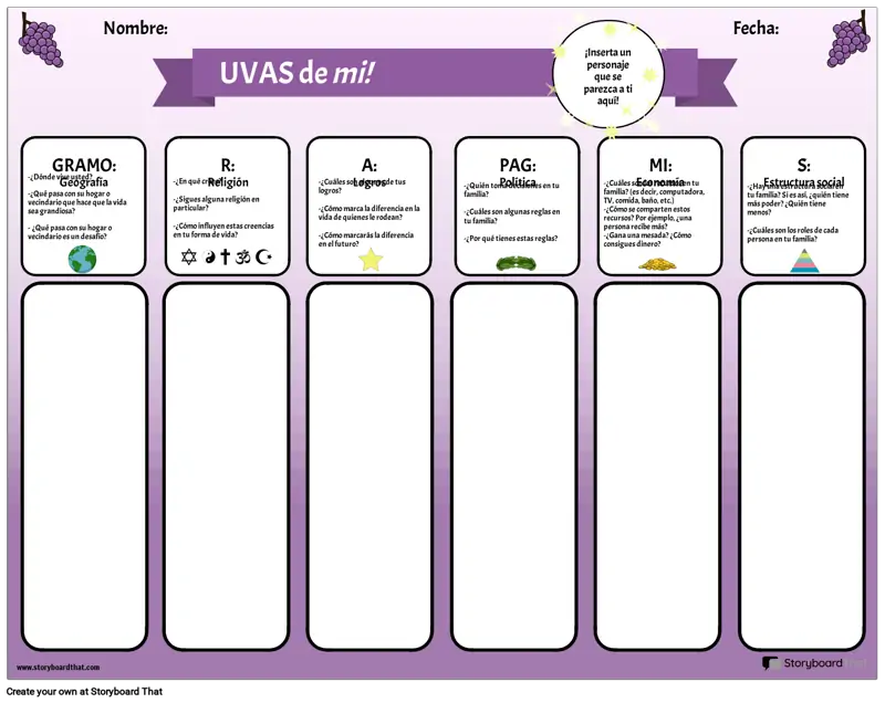 Utilice este organizador gráfico para presentar el acrónimo GRAPES a sus alumnos. Los estudiantes responden a las preguntas de cada categoría: geografía, religión, logros, política, economía y estructura social, reflexionando sobre sus propias vidas y experiencias. Una vez que hayan tenido la oportunidad de reflexionar y escribir, los profesores pueden dirigir una discusión en clase sobre cada categoría. Esta es una actividad útil para la construcción de comunidades, así como una forma de presentar este sencillo organizador gráfico que se puede utilizar para el estudio de cada civilización antigua.