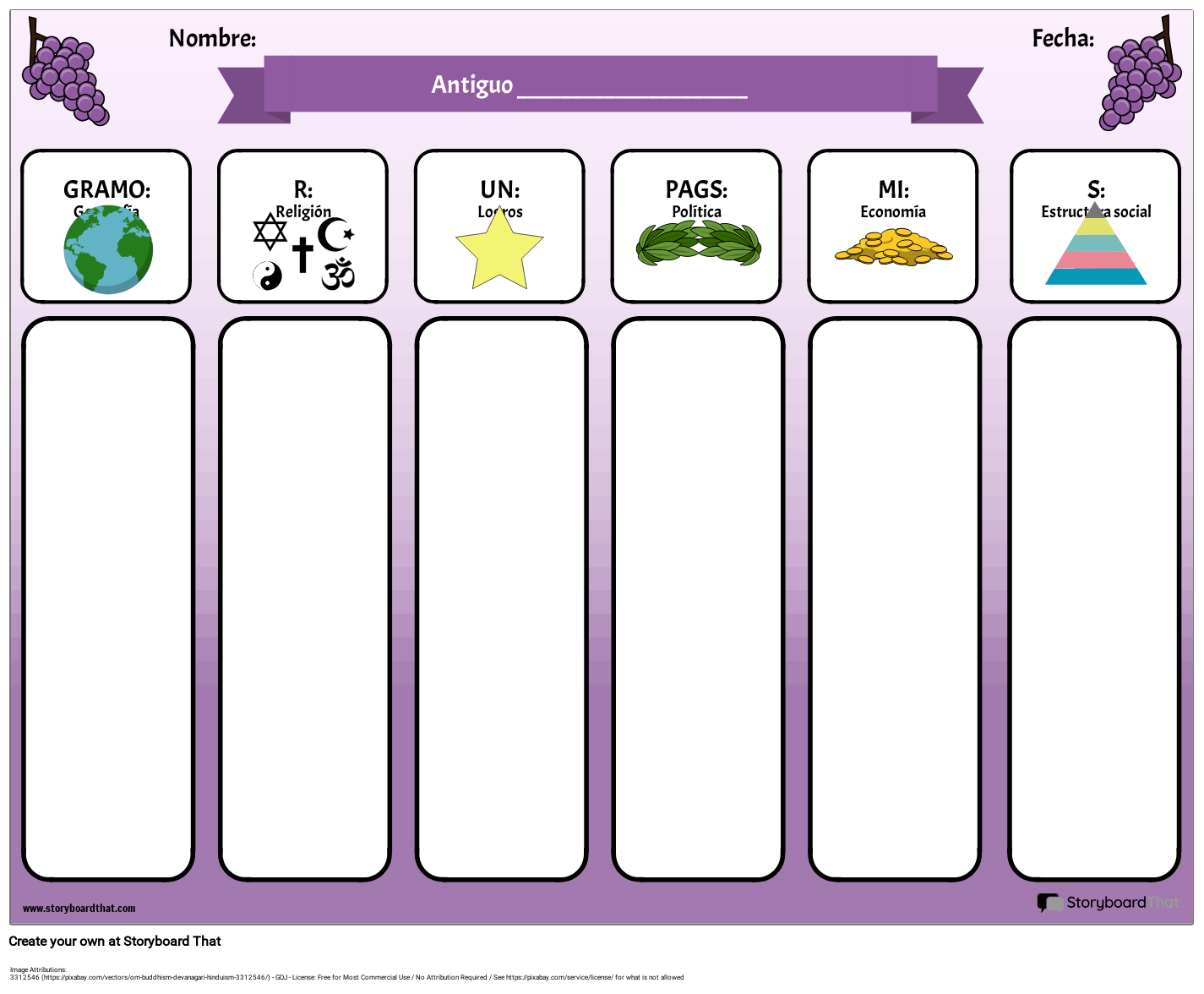El acrónimo GRAPES es una herramienta útil para estudiar sobre civilizaciones antiguas o diferentes países. Use esta tabla de UVAS digitalmente (haga que los estudiantes mecanografíen sus notas y agreguen imágenes en cada categoría) o imprímalo y los estudiantes pueden escribir sus notas a mano.