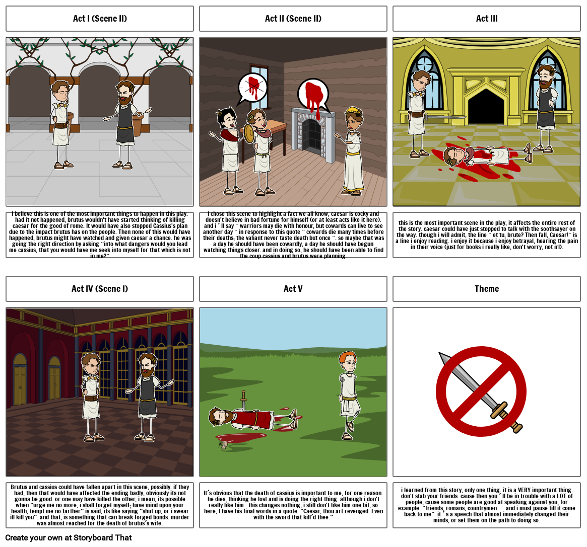 i learned from this story, only one thing. it is a VERY important thing. don't stab your friends. cause then you ´ ll be in trouble with a LOT of people, cause some people are good at speaking against you, for example. ¨friends, romans, countrymen......and i must pause till it come back to me¨. it ´ s a speech that almost immediately changed their minds, or set them on the path to doing so.