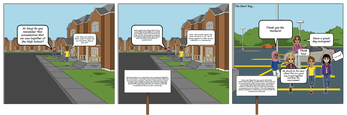 Some more things that you can do to help the environment is walking, turning off electronics when not in use, and taking public transportation. Carpooling is good for the environment because it reduces the number of vehicles on the road, lowering greenhouse gas emissions and air pollution. This comic shows how getting together as a community can benefit both the environment and people.