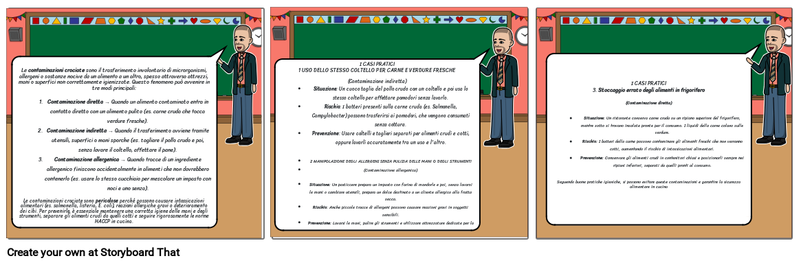 I CASI PRATICI 1 USO DELLO STESSO COLTELLO PER CARNE E VERDURE FRESCHE (Contaminazione indiretta)Situazione: Un cuoco taglia del pollo crudo con un coltello e poi usa lo stesso coltello per affettare pomodori senza lavarlo.Rischio: I batteri presenti sulla carne cruda (es. Salmonella, Campylobacter) possono trasferirsi ai pomodori, che vengono consumati senza cottura.Prevenzione: Usare coltelli e taglieri separati per alimenti crudi e cotti, oppure lavarli accuratamente tra un uso e l'altro.2 MANIPOLAZIONE DEGLI ALLERGENI SENZA PULIZIA DELLE MANI O DEGLI STRUMENTI (Contaminazione allergenica)Situazione: Un pasticcere prepara un impasto con farina di mandorle e poi, senza lavarsi le mani o cambiare utensili, prepara un dolce destinato a un cliente allergico alla frutta secca.Rischio: Anche piccole tracce di allergeni possono causare reazioni gravi in soggetti sensibili.Prevenzione: Lavarsi le mani, pulire gli strumenti e utilizzare attrezzature dedicate per la preparazione di alimenti senza allergeni.