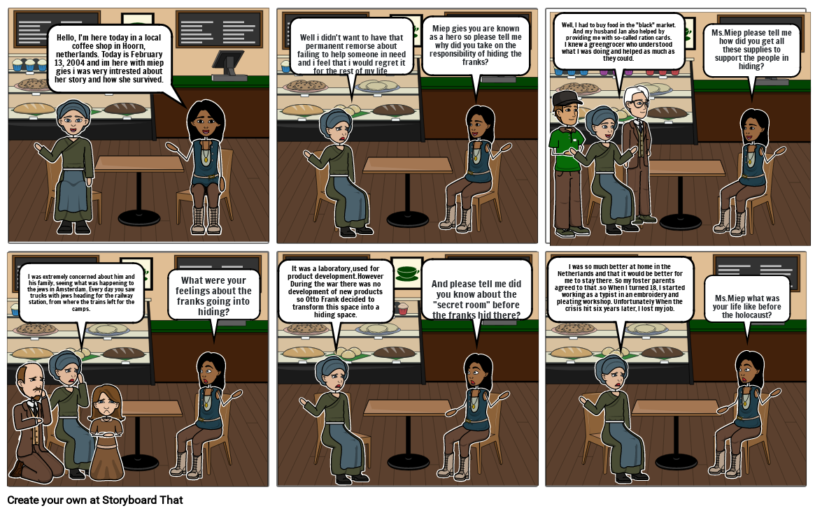 Hello, I'm here today in a local coffee shop in Hoorn, netherlands. Today is February 13, 2004 and im here with miep gies i was very intrested about her story and how she survived.