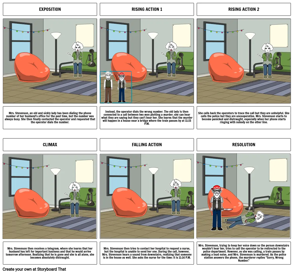 Mrs. Stevenson, trying to keep her voice down so the person downstairs wouldn't hear her, tries to call the operator to be redirected to the police department. However, as she was calling, a train passes by making a loud noise, and Mrs. Stevenson is murdered. As the police station answers the phone, the murderer replies "Sorry, Wrong Number."