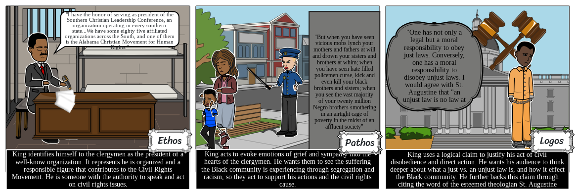 King uses a logical claim to justify his act of civil disobedience and direct action. He wants his audience to think deeper about what a just vs. an unjust law is, and how it effect the Black community. He further backs this claim through citing the word of the esteemed theologian St. Augustine