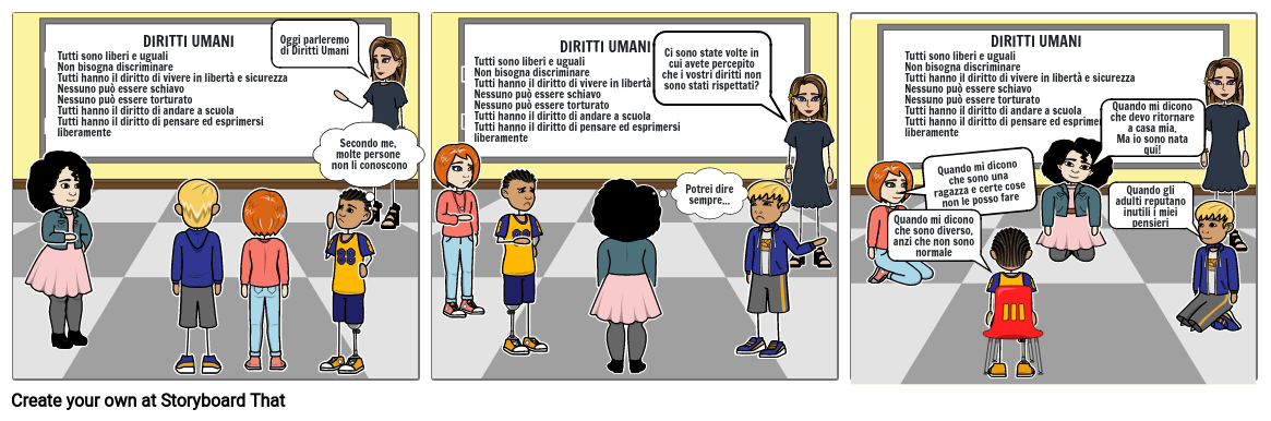 DIRITTI UMANITutti sono liberi e ugualiNon bisogna discriminareTutti hanno il diritto di vivere in libertà e sicurezzaNessuno può essere schiavoNessuno può essere torturatoTutti hanno il diritto di andare a scuolaTutti hanno il diritto di pensare ed esprimersi liberamente