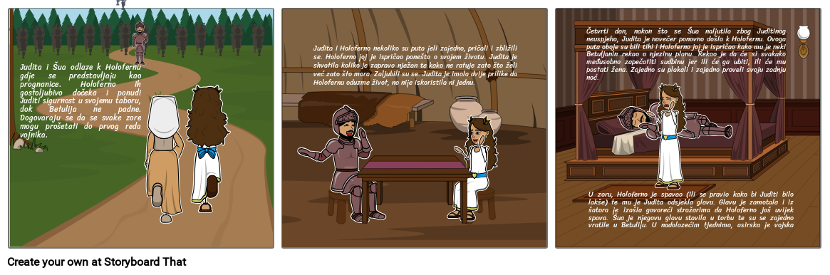 Judita i Holoferno nekoliko su puta jeli zajedno, pričali i zbližili se. Holoferno joj je ispričao ponešto o svojem životu. Judita je shvatila koliko je zapravo nježan te kako ne ratuje zato što želi već zato što mora. Zaljubili su se. Judita je imala dvije prilike da Holofernu oduzme život, no nije iskoristila ni jednu.
