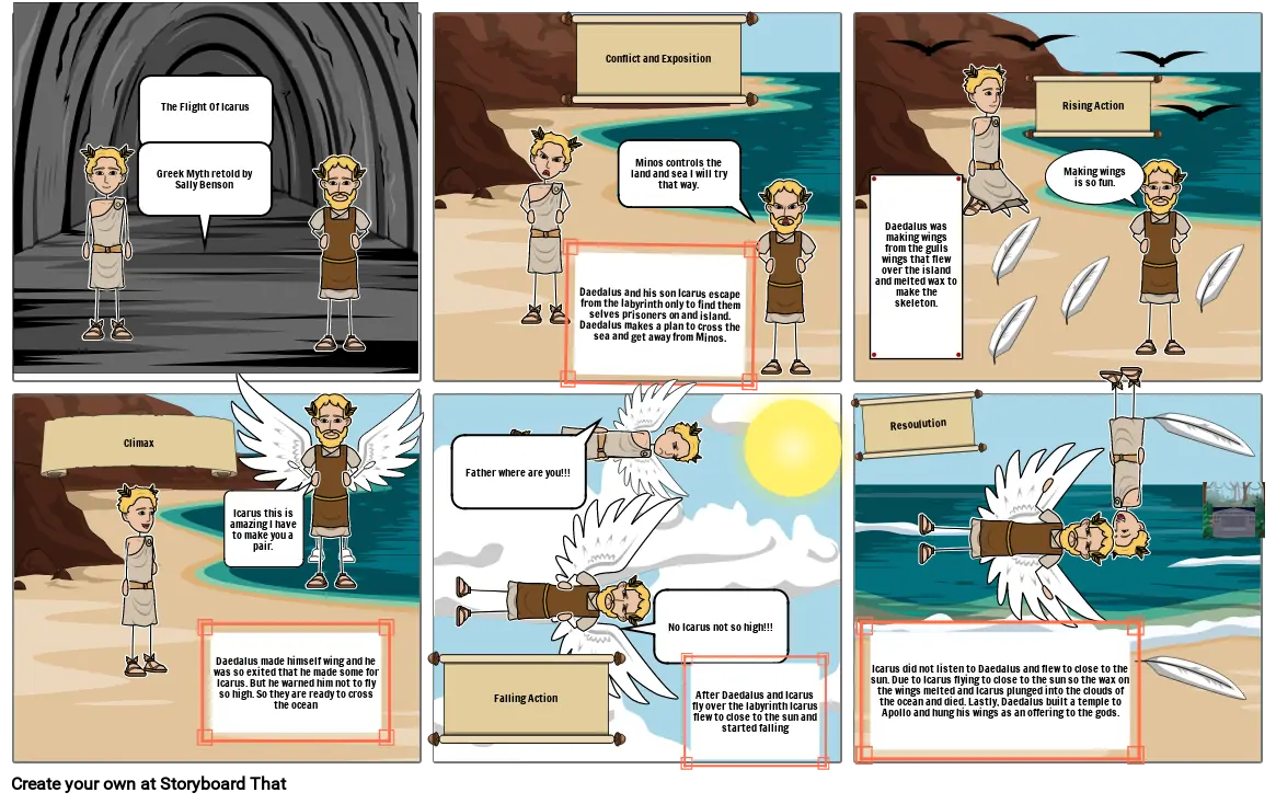 Icarus did not listen to Daedalus and flew to close to the sun. Due to Icarus flying to close to the sun so the wax on the wings melted and Icarus plunged into the clouds of the ocean and died. Lastly, Daedalus built a temple to Apollo and hung his wings as an offering to the gods.