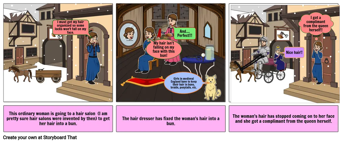 This storyboard that will show a medieval england woman getting her hair done, by a hairdresser in medieval times.