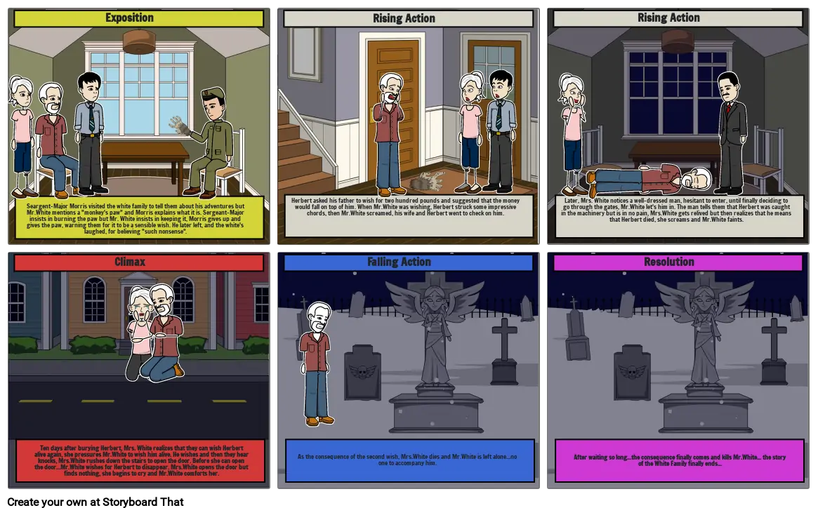Seargent-Major Morris visited the white family to tell them about his adventures but Mr.White mentions a "monkey's paw" and Morris explains what it is. Sergeant-Major insists in burning the paw but Mr. White insists in keeping it, Morris gives up and gives the paw, warning them for it to be a sensible wish. He later left, and the white's laughed, for believing "such nonsense".