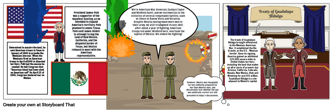 We're American War Generals Zachary Taylor and Winfield Scott, and we led America to the victories of several remarkable battles, such as those at Buena Vista and Veracruz. Despite Mexico having much more men in their army, we still triumphed! In late 1847, after about a year of fighting, American troops led under Winfield here, overtook the capital of Mexico. We ended the fighting!