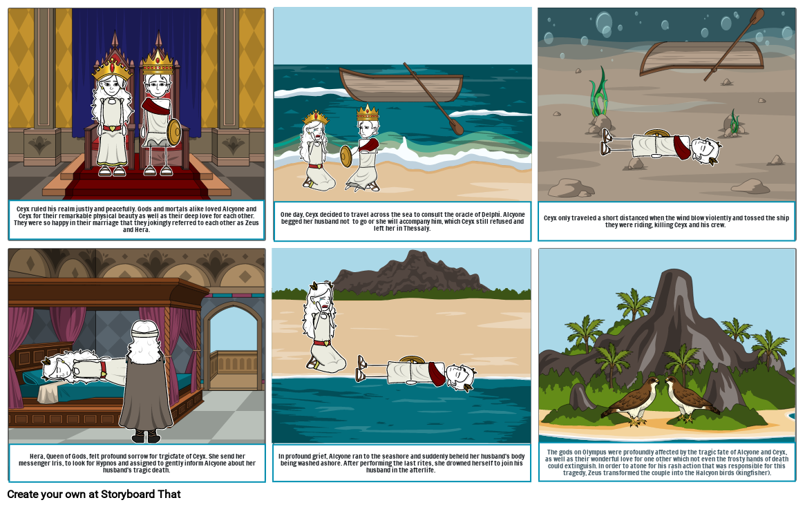 Ceyx ruled his realm justly and peacefully. Gods and mortals alike loved Alcyone and Ceyx for their remarkable physical beauty as well as their deep love for each other. They were so happy in their marriage that they jokingly referred to each other as Zeus and Hera.