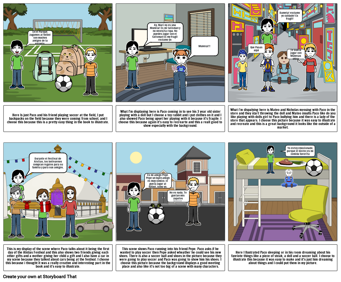 This scene shows Paco running into his friend Pepe. Paco asks if he wanted to play soccer then Pepe asked wheather he could see his new shoes. There is also a soccer ball and shoes in the picture because they were going to play soccer and Paco was going to show him his shoes. I choose this picture because the background displays a good meeting place and also like it's not too big of a scene with many characters.