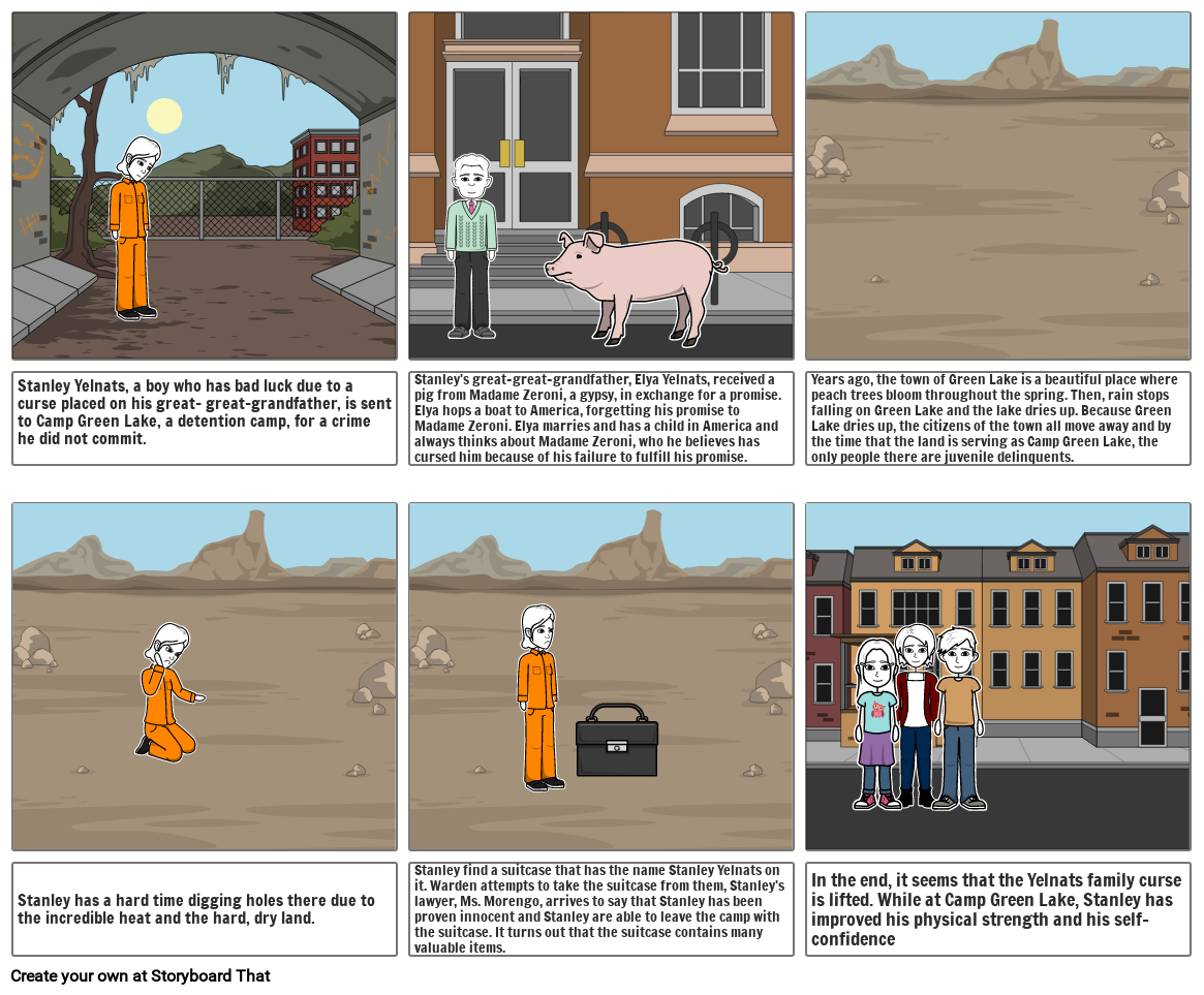 Stanley Yelnats, a boy who has bad luck due to a curse placed on his great- great-grandfather, is sent to Camp Green Lake, a detention camp, for a crime he did not commit.