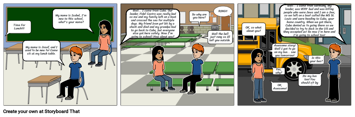 Well... I came from Germany, My leader, was VERY bad and was killing people who were Jews and I am a Jew, so we left on a boat called the MS St. Louis and were heading to Cuba, your home country. When we got there, Cuba denied us to going there so we decided to try to dock in the US and they accepted us! So now I'm here and I'm going to school too!