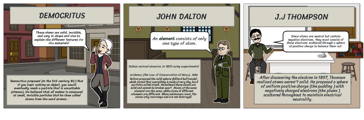Dalton revived atomism in 1803 using experimental evidence (the Law of Conservation of Mass). John Dalton proposed the solid sphere (billiard ball) model, which stated that everything is made of very tiny, hard particles called atoms. He believed these atoms are solid and cannot be broken apart. Atoms of the same element are the same, while atoms of different elements are different. When substances react, the atoms only rearrange and are not destroyed.