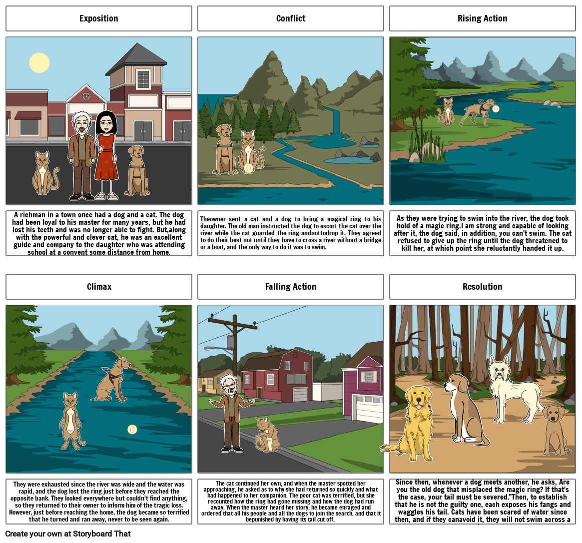 As they were trying to swim into the river, the dog took hold of a magic ring.I am strong and capable of looking after it, the dog said, in addition, you can't swim. The cat refused to give up the ring until the dog threatened to kill her, at which point she reluctantly handed it up.