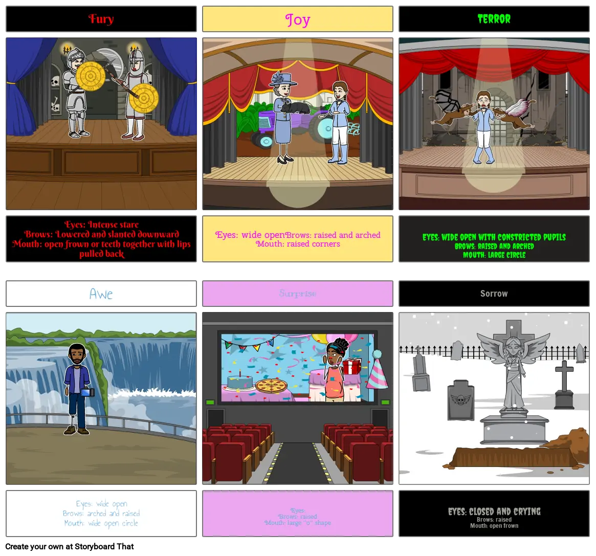 Eyes: wide open with constricted pupilsBrows: raised and archedMouth: large circle