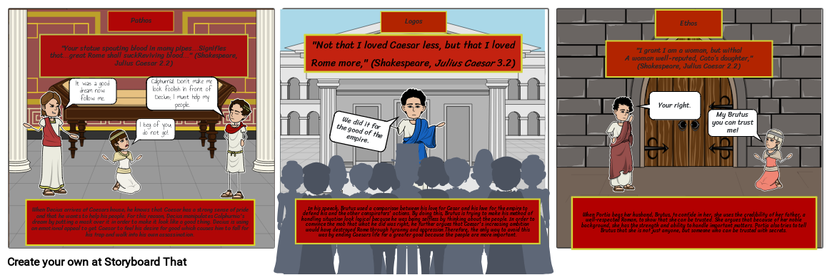 In his speech, Brutus used a comparison between his love for Cesar and his love for the empire to defend his and the other conspirators' actions. By doing this, Brutus is trying to make his method of handling situation look logical because he was being selfless by thinking about the people. In order to convince the mob that what he did was right, he further argues that Caesar's increasing ambition would have destroyed Rome through tyranny and oppression.Therefore, the only way to avoid this was by ending Caesars life for a greater good because the people are more important.