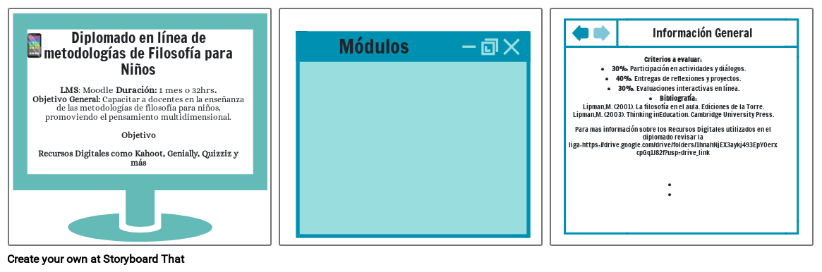 Criterios a evaluar:30%: Participación en actividades y diálogos.40%: Entregas de reflexiones y proyectos.30%: Evaluaciones interactivas en línea.Bibliografía:Lipman,M. (2001). La filosofía en el aula. Ediciones de la Torre.Lipman,M. (2003). Thinking inEducation. Cambridge University Press.Para mas información sobre los Recursos Digitales utilizados en el diplomado revisar la liga:https://drive.google.com/drive/folders/1hnahNjEX3aykj493EpY0erxcpGq1J82f?usp=drive_link
