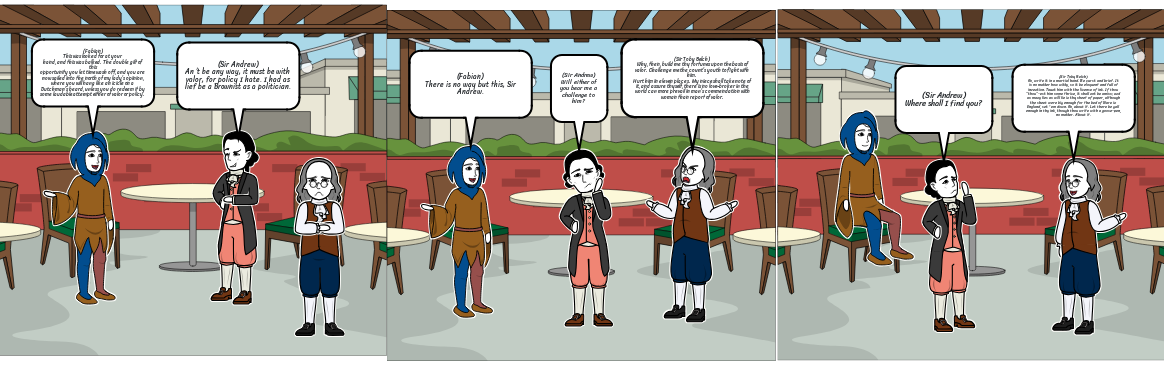 (Fabian)This was looked for at yourhand, and this was balked. The double gilt of thisopportunity you let time wash off, and you are now sailed into the north of my lady’s opinion, where you will hang like an icicle on a Dutchman’s beard, unless you do redeem it by some laudable attempt either of valor or policy.