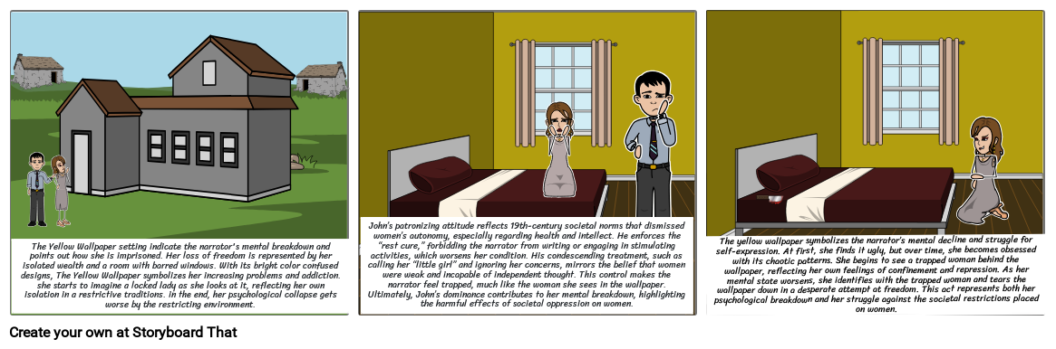 The Yellow Wallpaper setting indicate the narrator's mental breakdown and points out how she is imprisoned. Her loss of freedom is represented by her isolated wealth and a room with barred windows. With its bright color confused designs, The Yellow Wallpaper symbolizes her increasing problems and addiction. she starts to imagine a locked lady as she looks at it, reflecting her own isolation in a restrictive traditions. in the end, her psychological collapse gets worse by the restricting environment.