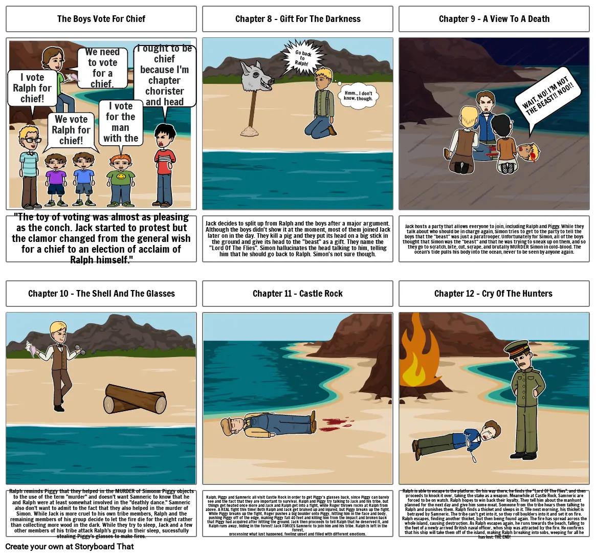 Jack decides to split up from Ralph and the boys after a major argument. Although the boys didn't show it at the moment, most of them joined Jack later on in the day. They kill a pig and they put its head on a big stick in the ground and give its head to the "beast" as a gift. They name the "Lord Of The Flies". Simon hallucinates the head talking to him, telling him that he should go back to Ralph. Simon's not sure though.