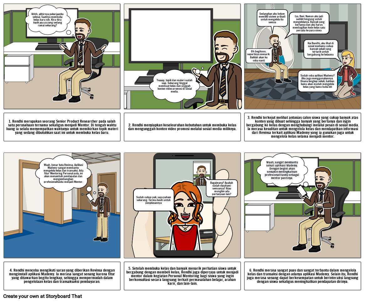 3. Rendhi terkejut melihat antusias calon siswa yang cukup banyak atas konten yang dibuat sehingga banyak yang bertanya dan ingin bergabung ke kelas dengan menghubungi melalui pesan di sosial media. Ia merasa kesulitan untuk mengelola kelas dan mendapatkan informasi dari Revinsa terkait aplikasi Mademy yang ia gunakan juga untuk mengelola kelas selama menjadi mentor.