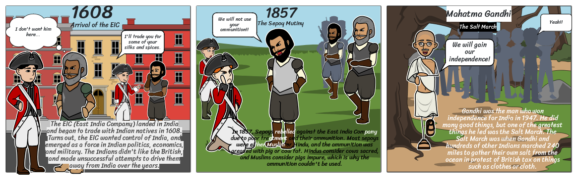 The EIC (East India Company) landed in India and began to trade with Indian natives in 1608. Turns out, the EIC wanted control of India, and emerged as a force in Indian politics, economics, and military. The Indians didn't like the British, and made unsuccessful attempts to drive them away from India over the years.