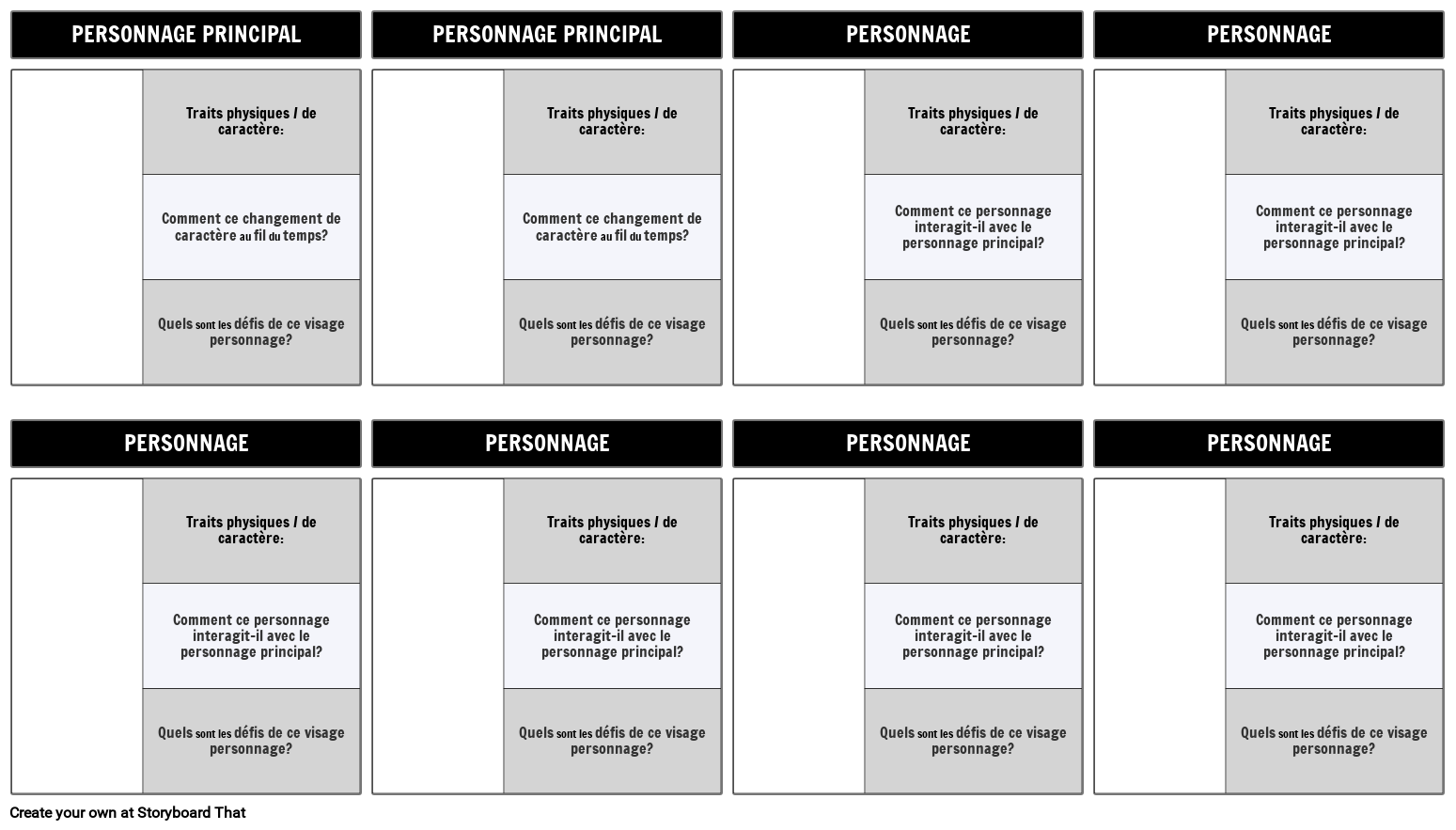 Modèle de carte de caractères avec des questions. Gardez facilement une trace des personnages littéraires.